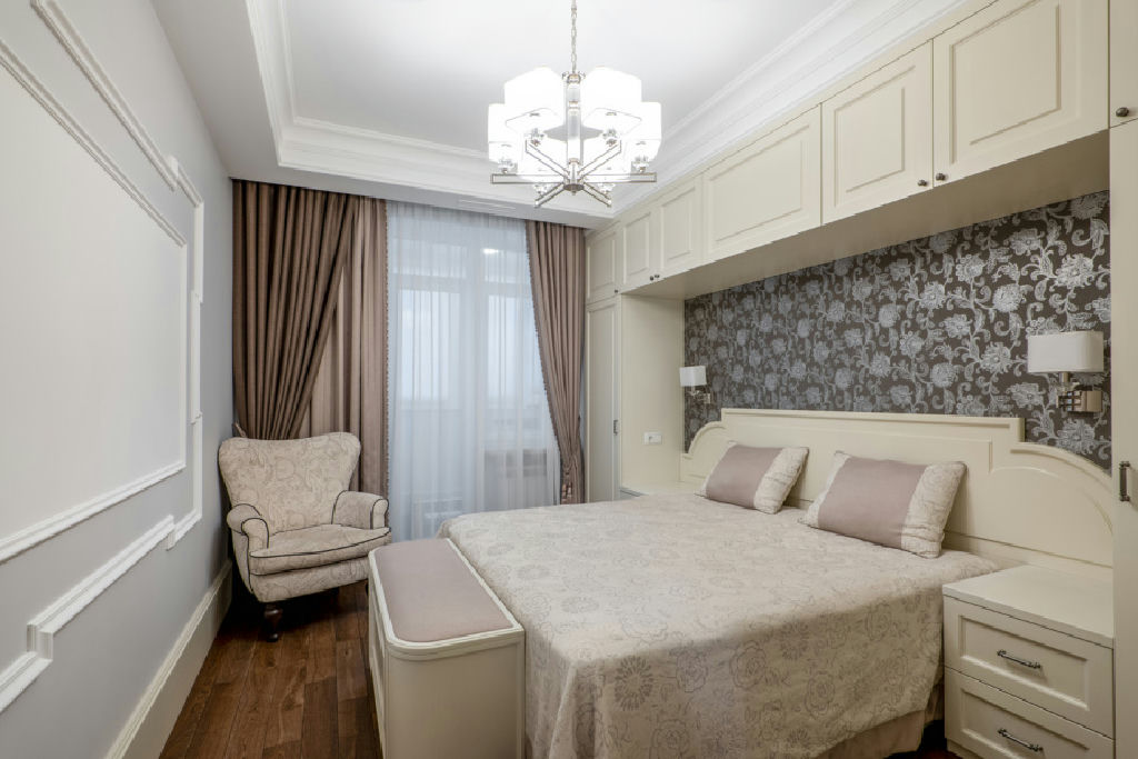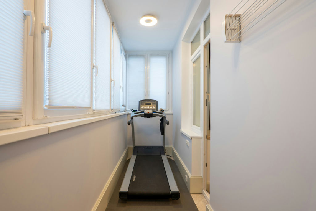 Основная спальня со стильным дизайном и продуманными местами хранения с выходом на балкон, где удобно разместилась беговая дорожка.