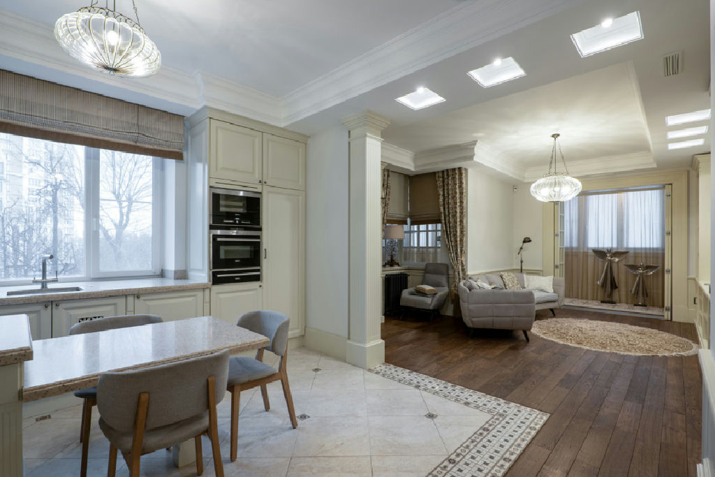 Просторная кухня-гостиная объединяет современную рабочую зону с новой высокотехнологичной бытовой техникой и пространство для отдыха, создавая идеальные условия для готовки, общения и комфортного времяпрепровождения.