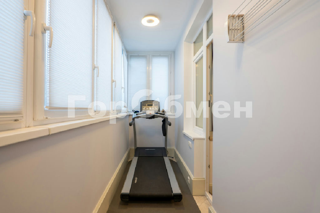 Основная спальня со стильным дизайном и продуманными местами хранения с выходом на балкон, где удобно разместилась беговая дорожка.